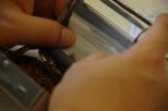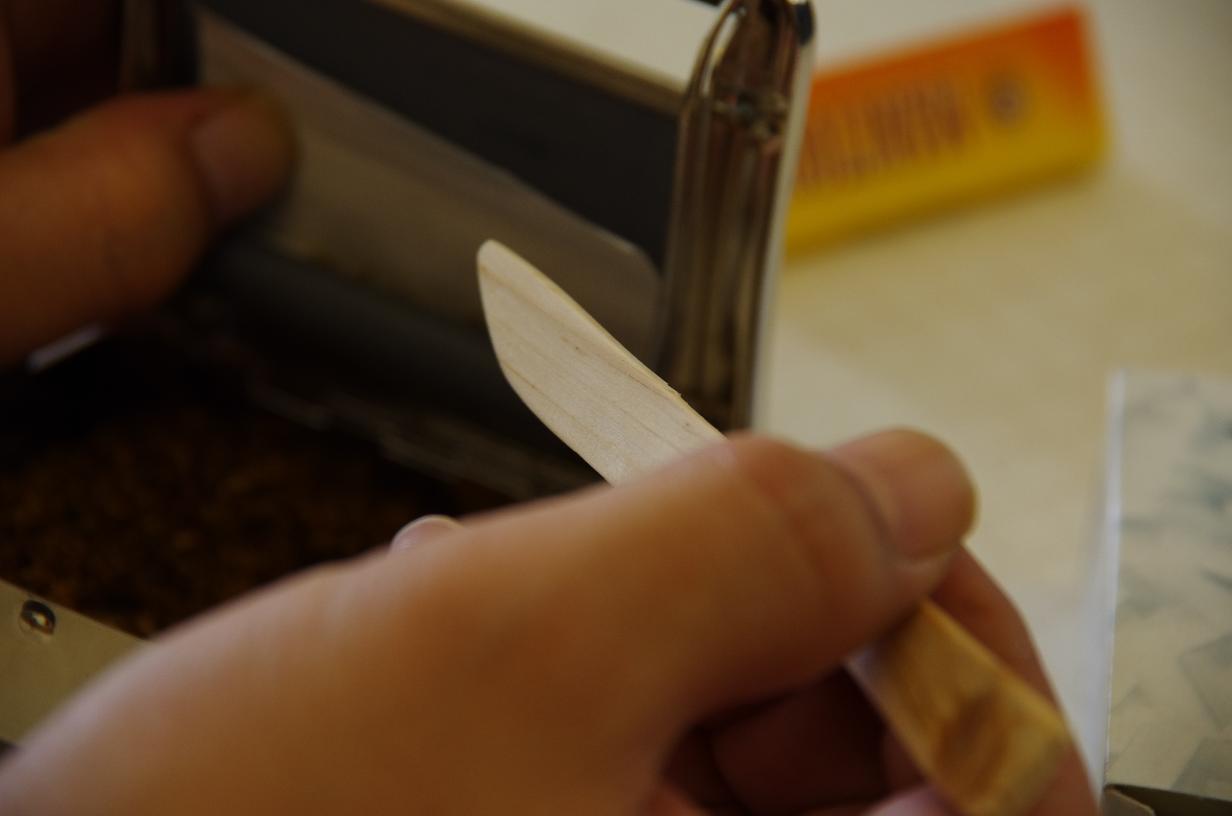 この道具は東雲彫りですが、適当なヘラの様な道具で奥に詰めるようにタバコを均します。