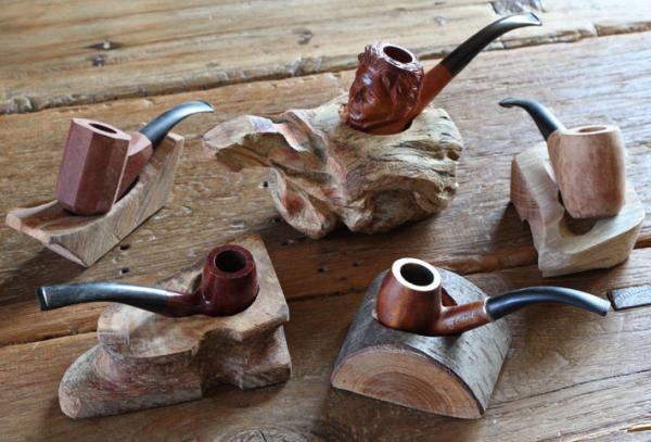 左奥のものと、右のスタンドは2方向からパイプを置くことができます。 多少大きめのパイプも置けるように穴を大きめにしてあります。 形、見栄え、色ともさまざまですが、それぞれ思い出が、想起できます。 木が奇妙であるほど、ユニークな パイプスタンドに変身した時が楽しいものです。 当店でパイプをお買い求めされると、丁度そのとき出来上がって残っている作品があればプレゼントできるかも?? 知れません。 |